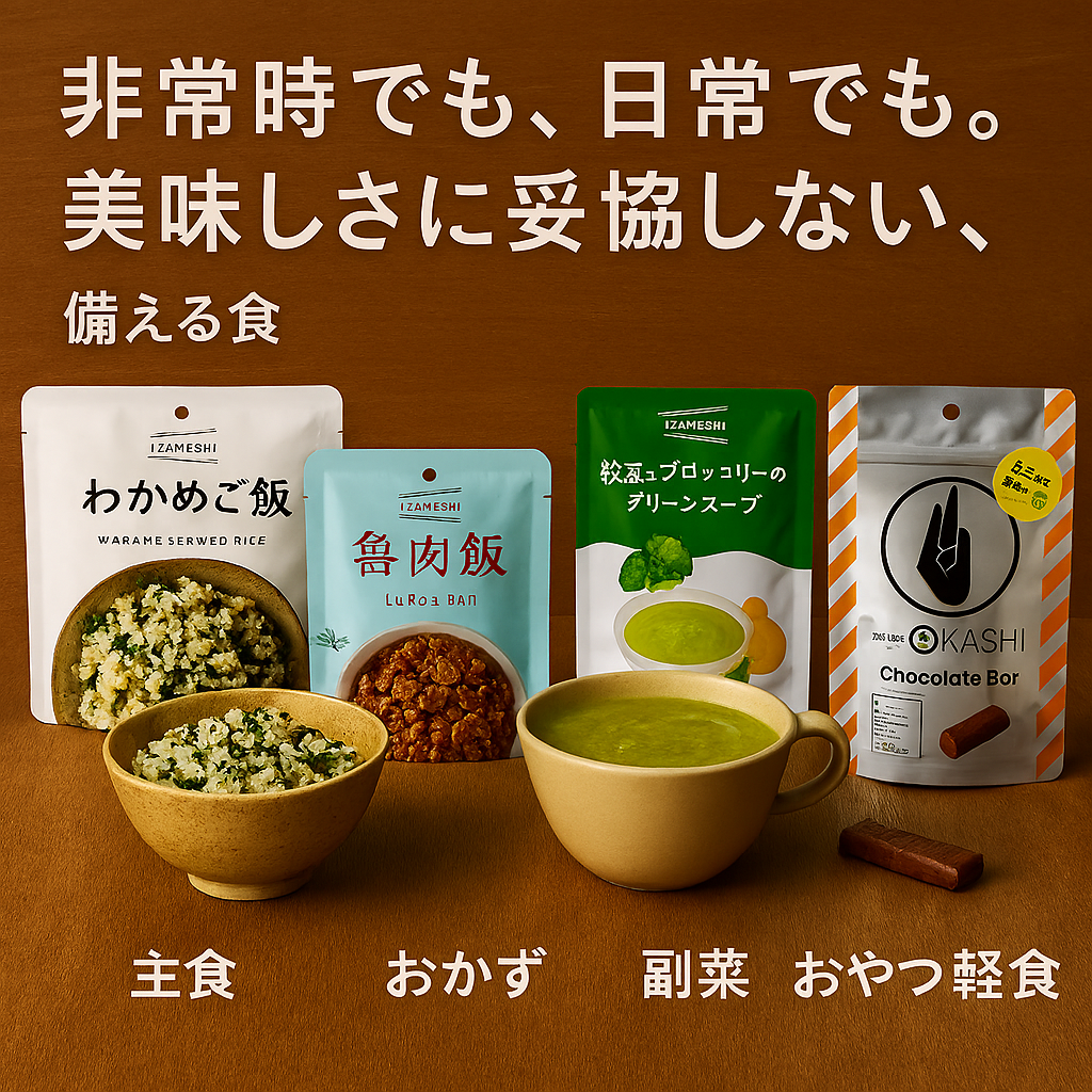 主食 非常食でも、主食は妥協しない。IZAMESHIの長期保存食シリーズ 災害時やアウトドア、忙しい日常にも。IZAMESHIの主食ラインナップは、調理不要でそのまま美味しく食べられる長期保存食です。 🌿 わかめご飯:やさしい塩味と香り高いわかめが特徴。非常時でもほっとする味わい。🍫 チョコデニッシュ:ふんわり食感と濃厚チョコが嬉しい、甘い保存パン。朝食やおやつにも。🍝 そのままPASTA ボロネーゼ:温め不要で食べられる本格パスタ。肉の旨みとトマトのコクが広がる一皿。🍜 きつねうどん:だし香るつゆとふっくらお揚げが魅力。和風の主食として人気。 「美味しい非常食」「長期保存できる主食」「調理不要の保存食」ならIZAMESHIで決まり! 備えるだけじゃない、“食べたい”を叶える保存食を、あなたの暮らしに。 おかず 🍱 IZAMESHIのおかずシリーズ:非常時でも、ほっとする味を災害時や忙しい日々の中でも、「食べること」は心を支える大切な時間。IZAMESHIのおかずシリーズは、そんな時にこそ嬉しい、手間いらずで美味しい一品を揃えています。長期保存が可能なのに、まるで家庭の味。今回は人気の3品をご紹介します。 🐟 梅と生姜のサバ味噌煮脂の乗ったサバを、梅酢と生姜でさっぱりと仕上げた味噌煮。濃厚な味噌のコクと爽やかな香りが絶妙に絡み合い、ご飯が進む一品です。骨まで柔らかく煮込まれているので、どなたでも安心して召し上がれます。🍢 おでん大根、こんにゃく、玉子、ちくわなど、定番具材がぎゅっと詰まった満足感たっぷりの一袋。出汁の染みた優しい味わいは、寒い日や疲れた時に心まで温めてくれます。保存食とは思えない本格派の味です。🍖 煮込みハンバーグ肉の旨みを閉じ込めたハンバーグを、野菜の甘みが溶け込んだデミグラスソースでじっくり煮込みました。ふっくらジューシーな食感と深みのある味わいは、まるで洋食屋の一皿。お子さまにも人気のメニューです。 おやつ、軽食 「いつものおやつが、もしもの備えに。」 IZAMESHIのおやつ・軽食シリーズは、日常にも非常時にもやさしく寄り添う美味しさ。 🍊IZAMESHI オレンジマフィン非常時でも、ほっと心ほどける甘さを。ブラッドオレンジピールを練り込んだ、爽やかな香りとほのかな甘みが特徴のオレンジマフィン。まるで懐かしいマーマレードを思わせる味わいが、朝食にもおやつにもぴったりです。缶を開ければすぐに食べられる手軽さで、調理不要・缶切り不要。非常食とは思えないほどのしっとり食感と優しい風味が、災害時のストレスをやわらげてくれます。🍡黒みつきなこ餅もっちり餅に、香ばしいきなこと濃厚黒みつがとろり。 水も割り箸もセットで、どこでも和スイーツタイムが楽しめます🍡黒みつきなこ餅もっちり餅に、香ばしいきなこと濃厚黒みつがとろり。 水も割り箸もセットで、どこでも和スイーツタイムが楽しめます🍫チョコバー5種の穀物入りでザクザク食感、甘さ控えめの満足系チョコバー。 溶けにくくて携帯にも便利、防災リュックに忍ばせたい一品です